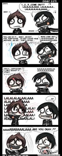 Gerard: No tengo nada. Realmente me gustan los tatuajes. Pero soy como un gatito con las agujas. Les tengo miedo a las agujas, incluso cuando me sacan sangre y esa mierda. Tengo que bajar la cabeza y hacer una respiración especial con el medico o me puedo desmayar. Creo que es una buena adición en algunas personas. En algunos, es algo fácil. Pero realmente no lo es para mí. Siempre quise a una viuda negra en mi cuello. Me gustaría algo así.